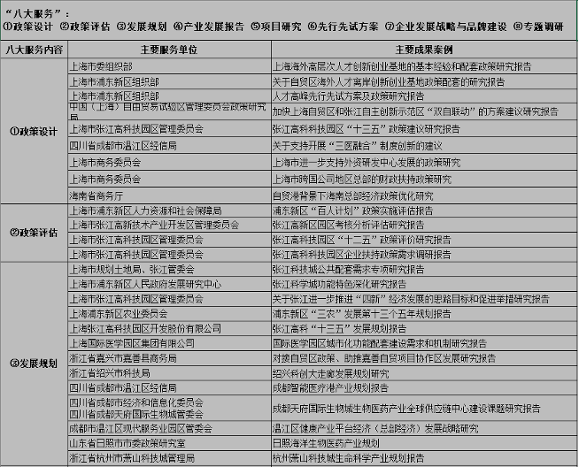 研究院立足张江,服务全国。为上海市承担上海科创中心、自贸区联动、上海五个中心深度融合行动方案、张江科学城、张江药谷、张江医谷、集成电路产业发展规划等决策咨询课题研究。承接成都市、杭州市、嘉兴市、绍兴市、日照市、海南省等兄弟地区生物医药产业规划和总部经济、平台经济等相关课题研究,以及开展产业功能园区平台公司运营管理人才培训。并与长三角多城市和成都、海南、杭州等地有关部门签订招商协议。