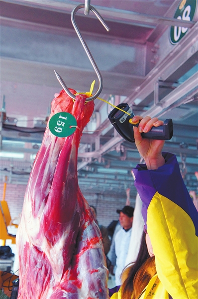 记者在现场看到,进入牛羊肉交易区的每一块肉品上都挂有一个条形码标签。“每一头牛、羊在养殖场都会有一个耳标,进入了上农批,我们就会给它们戴上对应的标签,做到信息对接。”上农批经营管理有限公司常务副总经理张春华表示。