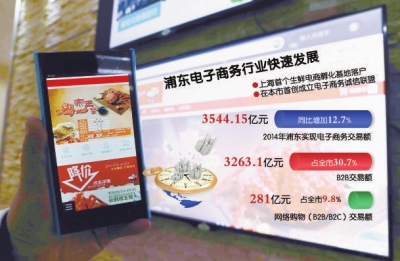 近年来,浦东新区电子商务持续快速发展。目前,新区的B2B、B2C和C2C电子商务模式齐全,现货交易和中远期交易、专业平台和大宗商品市场、综合平台和跨境电子商务等形态多样,而且初步形成了门类齐全、起点较高的新兴电子商务企业集群。早前市商务委公布统计数据,2014年全市电子商务交易总额达13594亿元,浦东电子商务交易额占全市近三分之一。