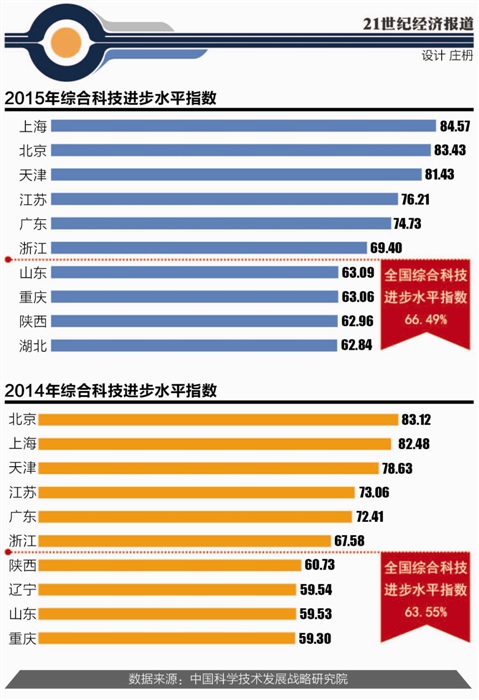 《报告》显示,2015年上海综合科技进步水平指数为84.57,超过北京的83.43,成为全国首位,天津、江苏、广东、浙江紧跟其后。而2014年,北京的综合科技水平指数为83.12超过上海的82.48,居全国首位。