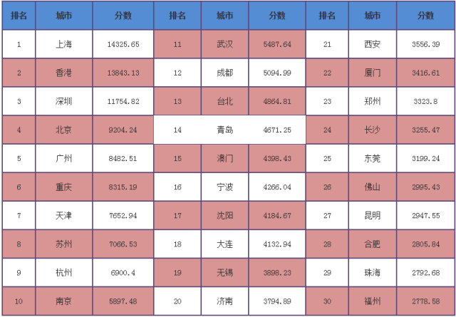 位列第四至第十名的城市分别是北京、广州、重庆、天津、苏州、杭州及南京。上海在该评比中已是连续4年排名首位。
