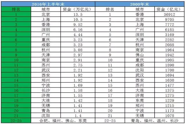 2000年的时候,广州汇聚的资金总量超过“天津+重庆+成都”。但到了2016年中期,这三个城市都距离广州不太远了!