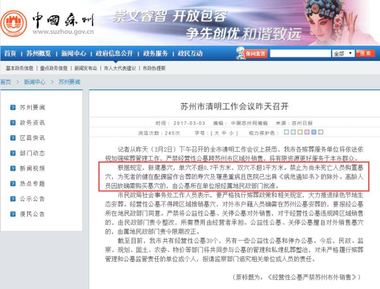 苏州市市民政局社会事务处工作人员表示,要严格执行殡葬政策和相关规定,大力推进绿色节地生态安葬。