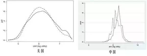 中美两国城市人口结构对比。实线代表美国的大城市,虚线代表中小城市,横轴可以理解为人的教育水平,纵轴是分布。可见,基本上在两端大城市分布会突出来。而在中国(右图),中国的大城市(实线)的人口技能结构基本上往右偏,左边没有多出来。说明缺少低端人口。