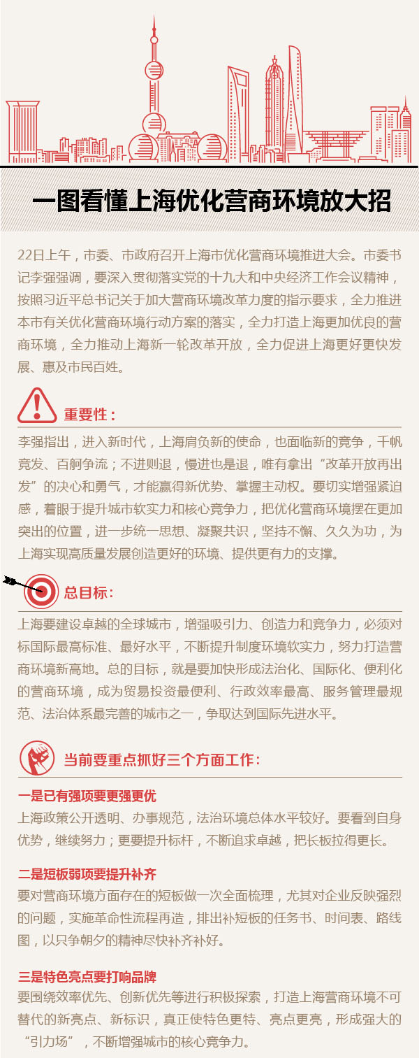 营商环境就是生产力。站在中国经济从高速增长阶段转向高质量发展阶段这一新的历史起点上,上海正着力营造更具吸引力的法治化、国际化、便利化的营商环境,降低制度性成本,培育提升国际竞争新优势。12月22日,市委市政府召开的上海市优化营商环境推进大会提出,把优化营商环境摆在更加突出的位置,全力落实优化营商环境行动方案,在与会企业界引起强烈反响。